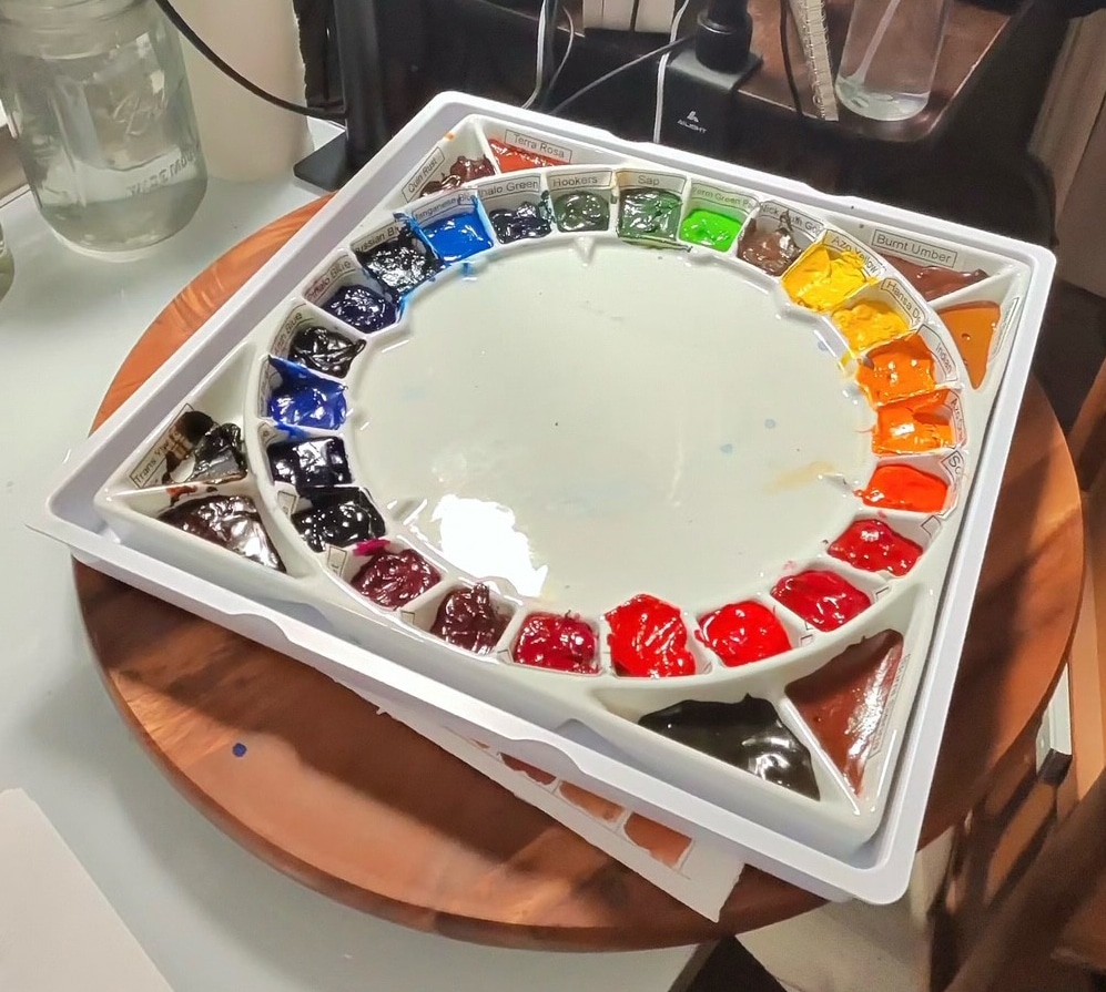 - The Large Quiller Palette – dedicated almost entirely to transparent, staining colors arranged for clean mixing.