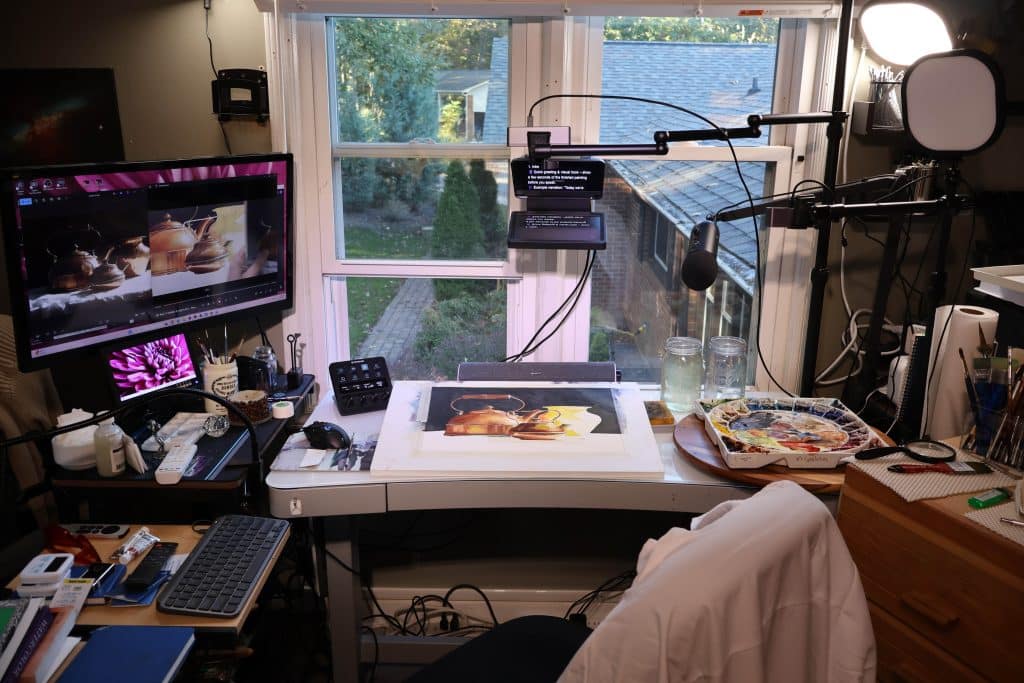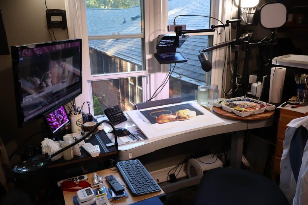 My drawing tables, camera control table, and painting table. I have built a unique easy to reach what I need studio. Everything is immediate and at my fingertips
